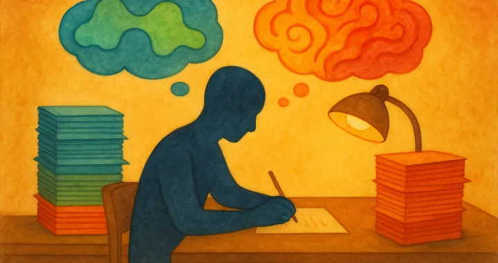 • Man thinking and writing articles, with a tall stack on the left (autism) and a shorter stack on the right (bipolar disorder)