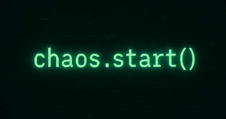• Illustration of chaos.start() as a line of code on a glitchy background